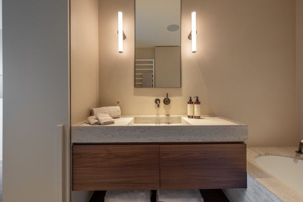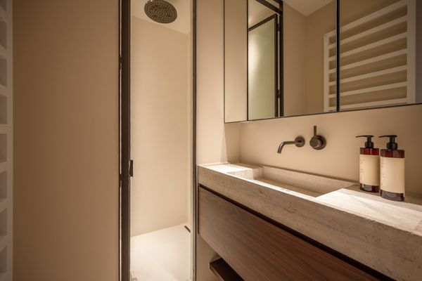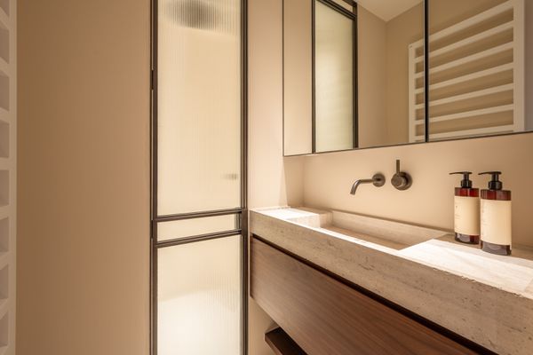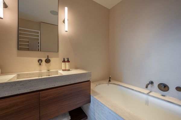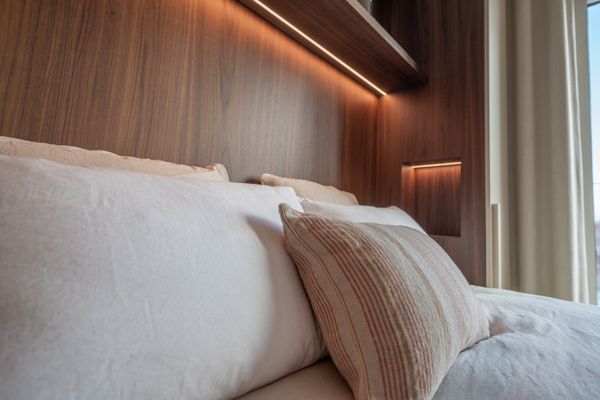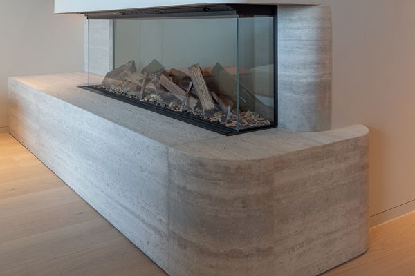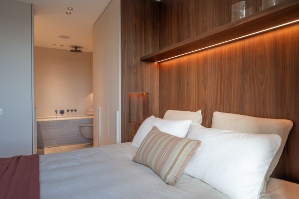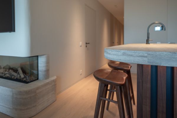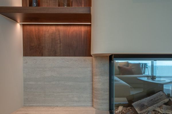 The finishing level is exceptional: recessed sockets, integrated rail lighting, LED illumination within custom cabinetry, and subtle natural stone curves create an atmosphere of understated luxury.