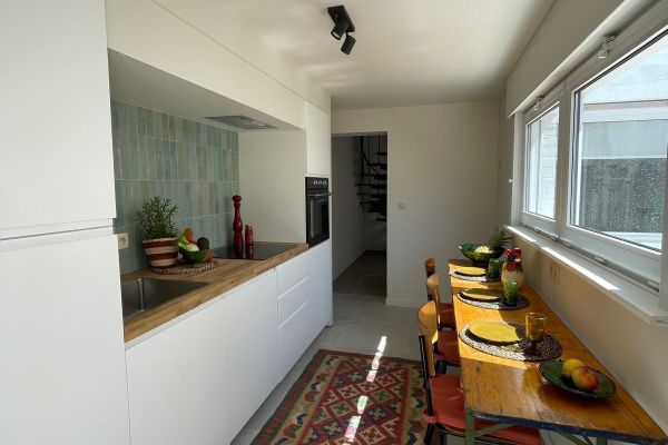 The property features a bright living area opening onto a sunny courtyard. The kitchen is practical, with a storage area including washing machine connection and a separate toilet at the rear. An additional front door with direct access to the courtyard offers extra convenience, ideal for bicycle storage.
