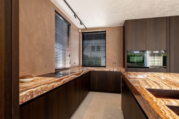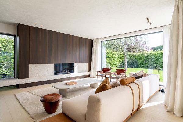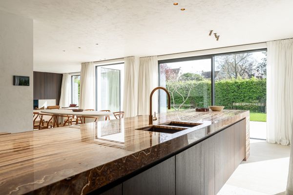 Via de inkomhal met op maat gemaakte vestiaire en gastentoilet betreedt u de ruime, lichtrijke leefruimte die uitkijkt op de prachtig aangelegde tuin. Een ingewerkte open haard, parketvloeren en strakke maatkasten zorgen voor een warme en tijdloze sfeer. De indrukwekkende keuken is voorzien van een imposant werktablet, Miele toestellen en een ingebouwde wijnfrigo. Een aansluitende bijkeuken/wasplaats volledig uitgerust met maatkasten maakt het geheel functioneel compleet. Aansluitend bevindt zich de ruime garage met toegang tot de woning.