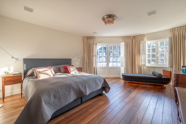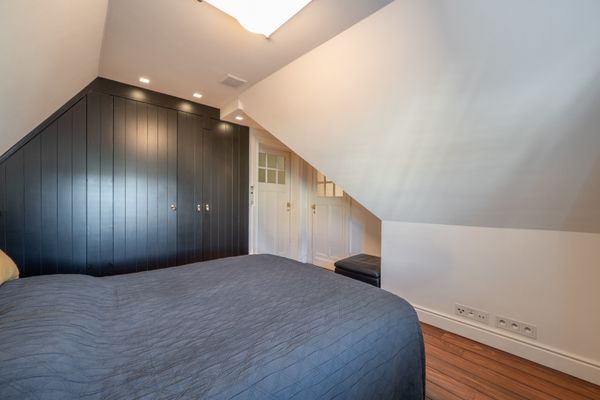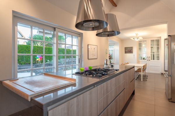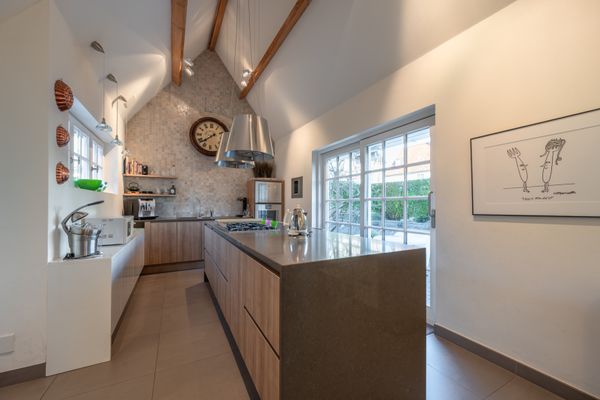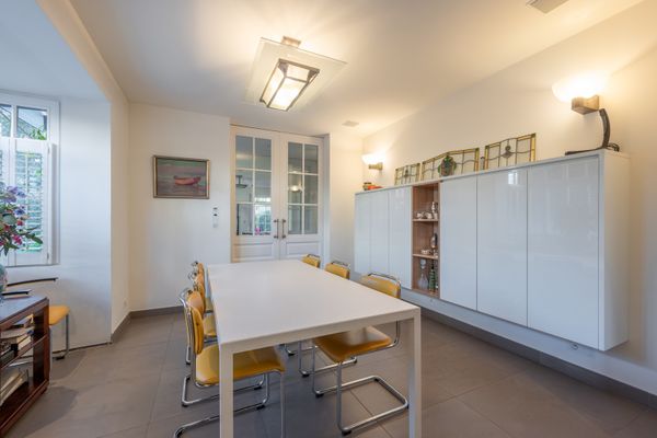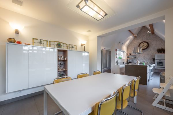 Spacieux hall d’entrée avec vestiaire et toilette invités. Agréable espace de vie lumineux avec feu ouvert au gaz. Cuisine entièrement équipée avec salle à manger attenante et débarras pratique. Belle terrasse et jardin avec étang.