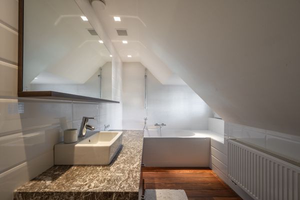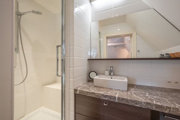 Le deuxième étage offre une deuxième chambre avec salle de douche privative (douche, lavabo et toilette) ainsi qu’une troisième chambre avec salle de bains attenante (baignoire, lavabo et toilette). Espace grenier pratique.