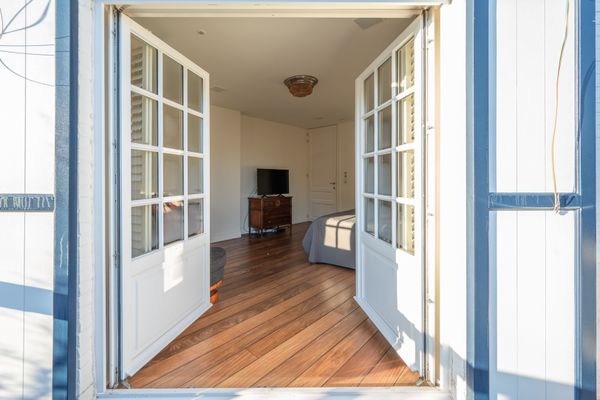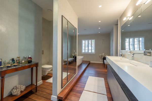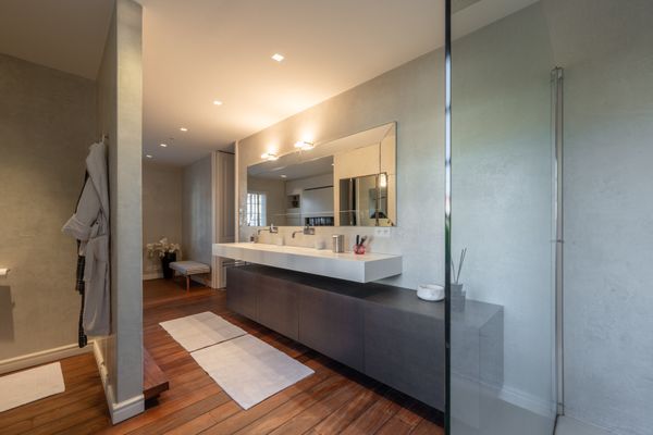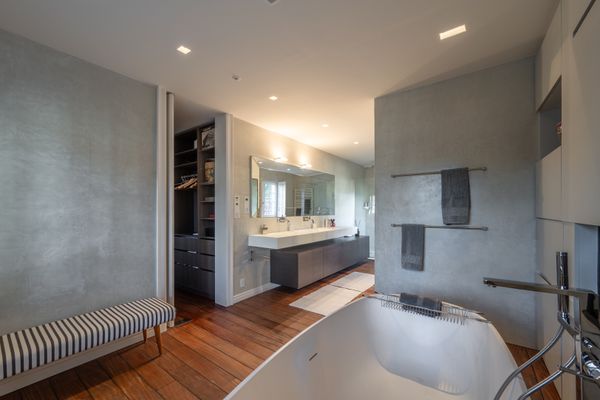 Au premier étage, une grande chambre avec accès à la terrasse et salle de bains attenante comprenant baignoire, douche, double lavabo et toilette.