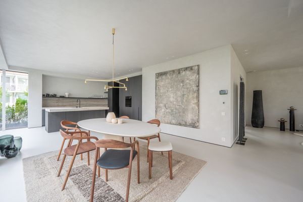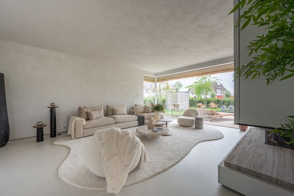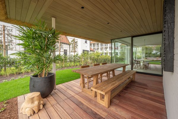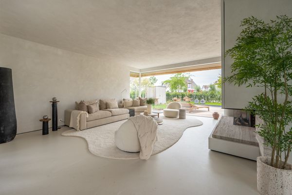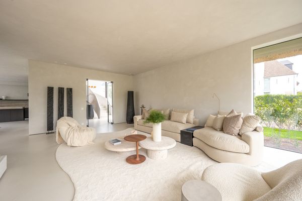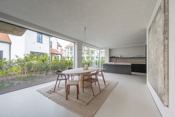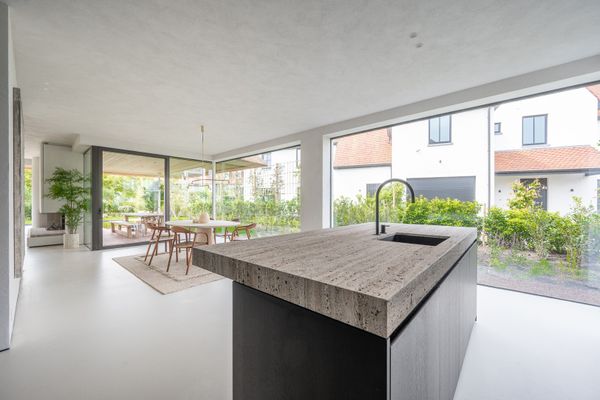 Ruime en lichtrijke leefruimte met grote raampartijen met minimal windows uitgevend op een overdekt terras en tuin. De tuin is perfect Zuid gericht en beschikt over een zwembad (8m00 op 2m50), verwarmd door een warmtepomp.