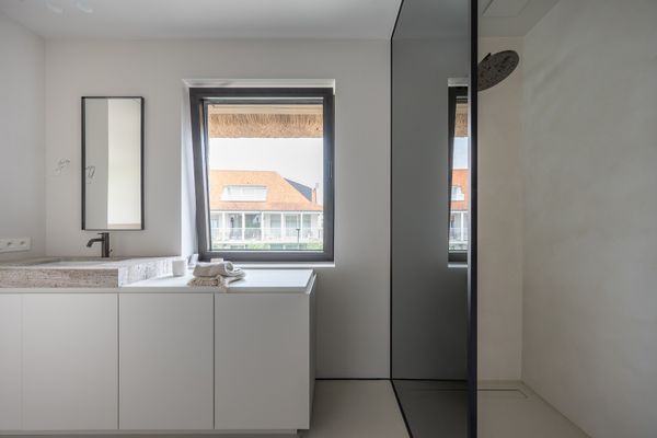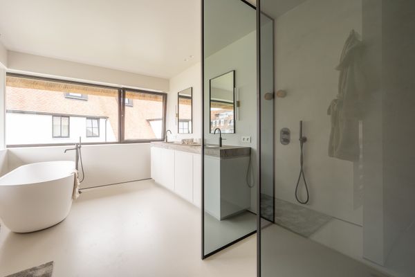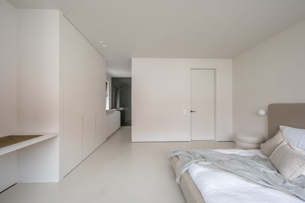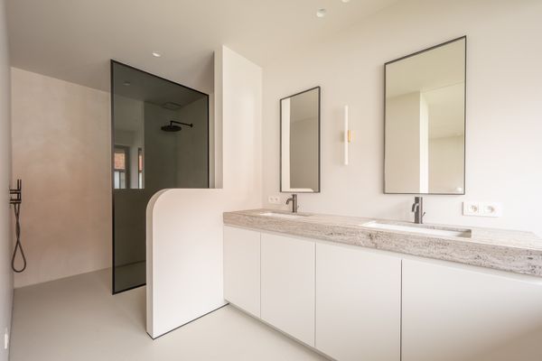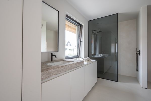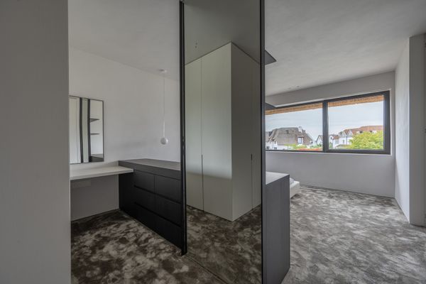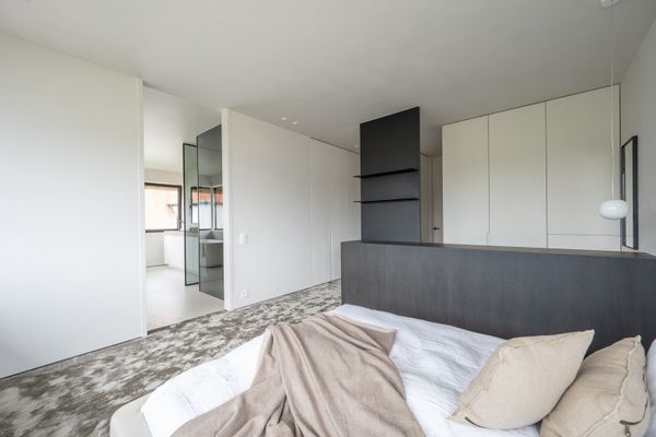 1e verdieping: ruime masterbedroom met inloopdressing en ensuite badkamer. Slaapkamer 2 en 3 zijn telkens royaal en voorzien van een eigen complete badkamer.