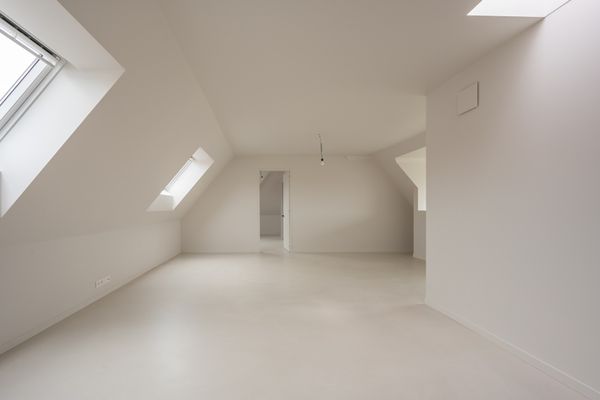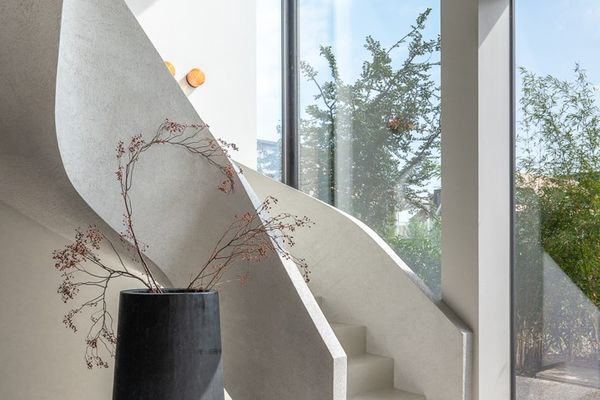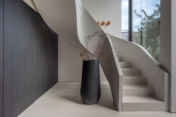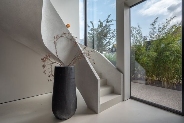 Voor de vloer en trappen is een naadloze, milieuvriendelijke premium gietvloer met akoestisch effect.