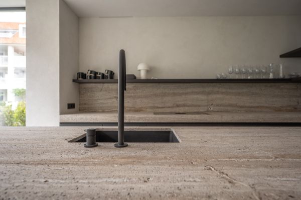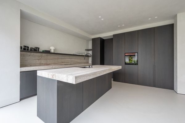 Luxueuze open keuken met eiland voorzien van een natuurstenen werkblad. Praktische bijkeuken/berging waar alle technieken zijn weggewerkt met extra kasten. Extra inkomdeur via de bijkeuken.